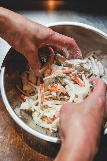 ③ボウルに②を入れて小麦粉をまぶし、全体をほぐしながら混ぜ合わせる。先に小麦粉を薄くまぶして衣をつきやすくする。