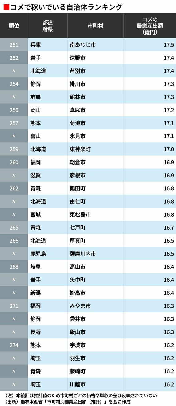 「コメで稼いでいる」自治体ランキング 5位は山形県鶴岡市、4位は秋田県横手市、ではトップ3は?