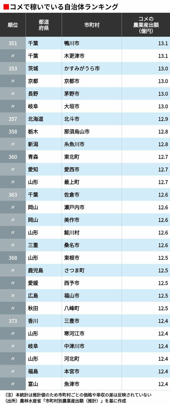 「コメで稼いでいる」自治体ランキング 5位は山形県鶴岡市、4位は秋田県横手市、ではトップ3は?