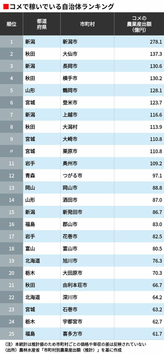 「コメで稼いでいる」自治体ランキング 5位は山形県鶴岡市、4位は秋田県横手市、ではトップ3は?