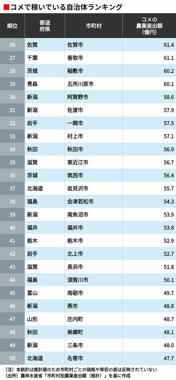 「コメで稼いでいる」自治体ランキング 5位は山形県鶴岡市、4位は秋田県横手市、ではトップ3は?