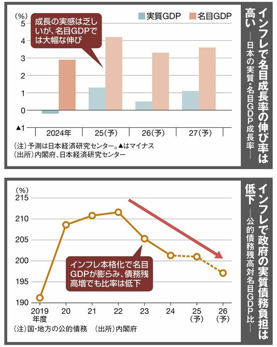 さらに政府は実質債務減少も享受する。公的債務の健全性は通常、名目GDP(国内総生産)比でみる。インフレで分母の名目GDPが実質以上に膨らめば、分子の債務が多少増えても比率は低下する。