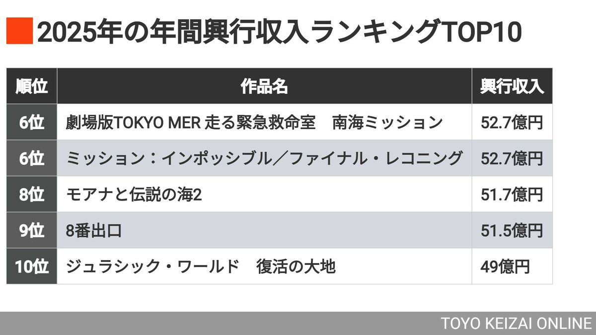 そんな25年の「年間興行収入ランキングTOP10」は、邦画がアニメ3作、実写4作、洋画がアニメ1作、実写2作と、例年以上に実写が健闘した1年となった。
