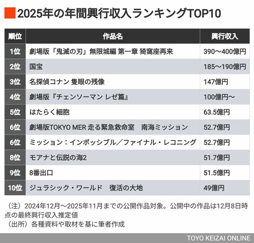 この2作だけでも近年稀に見る破格のヒットなのだが、それだけで終わらなかったのが今年だ。年間ランキングで続くアニメ2作も100億円を超えるスーパーヒットになっている。