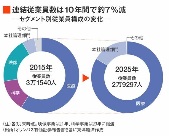 管理部門に属する中堅の男性社員は、そう嘆く。現在の国内のグループ会社含む従業員1万1420人のうち過半数を40代以上が占めており、事業売却前の20年時点のデータでは、オリンパス本体の管理職比率は約20%に達していた。