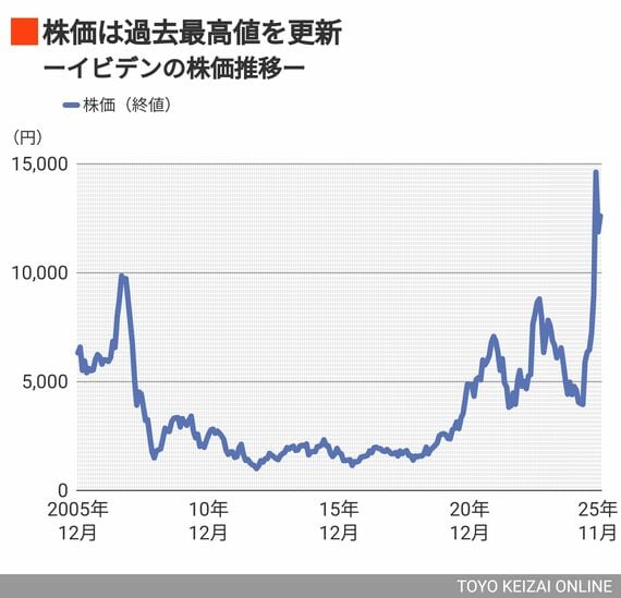 発端は10月末だった。日本経済新聞が日経平均構成銘柄からニデックを除外し、代わりに採用されたのがイビデンだった。11月に株価は急騰し、年初来高値を大きく更新。足元は調整局面にあるが、それでも20年来の高値圏で推移している。