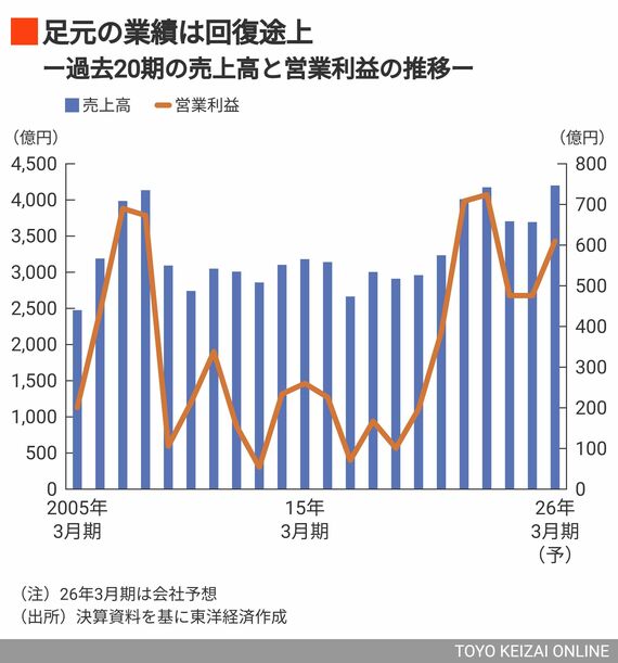 現在もなお、この工場は稼働しておらず、経営にとっては重荷の状態。そんな中でもイビデンの見直しが進む要因は、短期的には複数ある。まず挙げられるのは、AIサーバー向けの出荷が増えたことによる、26年3月期業績の上方修正。さらに、ずっと赤字が続いていたインテルのパソコン向けの基板ビジネスがようやく黒字化したことだ。