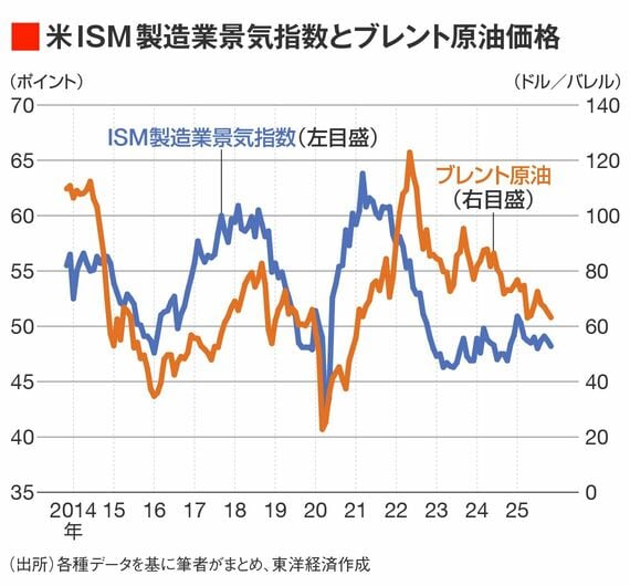 26年のアメリカ景気は26年1月~3月頃に底入れし、回復基調入りするというのが市場コンセンサスである。この見通し通りであれば原油価格は来年の春頃まで水準を切り下げるが、それ以降は年後半にかけて水準を切り上げるというのがメインシナリオになると予想される。