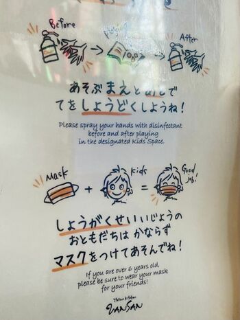 よく見ると、キッズスペースの両脇に注意書きがあった。「このエリアは未就学児をお連れのお客様のご利用に制限させていただいております」「しょうがくせいいじょうのおともだちはかならずマスクをつけてあそんでね!」