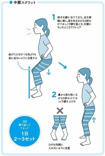 まず、肩幅より少し広めに足を開いて立ち、両手を腰に当てます。そして、口から息を吐きながら中腰になるまでゆっくり腰を落としていき、次に、鼻から息を吸いながらゆっくり腰を上げていくのです。これを3回繰り返して1セットとなります。