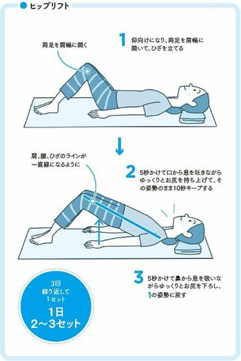 まず、仰向けになって、両足を肩幅に開いてひざを立てた姿勢をとってください。次に、口から息を吐きながらゆっくりとお尻を持ち上げていきます。肩、腰、ひざのラインが一直線になるまでお尻を持ち上げたら、その姿勢のまま10秒間キープし、その間は息を止めずにゆっくり呼吸してください。その後、鼻から息を吸いながらゆっくりお尻を下ろしていきましょう。これを3回繰り返して1セットです。