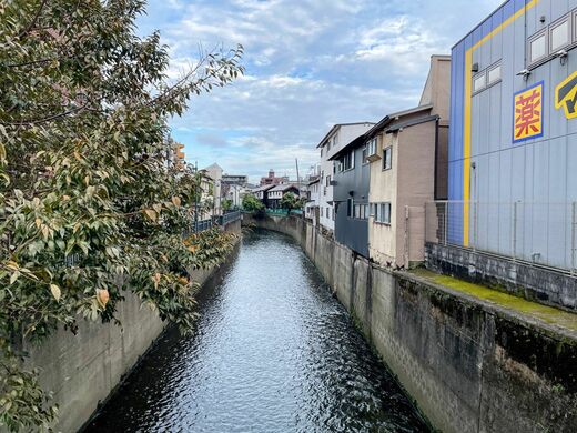 2つの駅を分けるように妙正寺川が流れている。駅をつなぐ中井駅前通りの途中にある寺斉橋から眺めると、川に隣接するようになった店舗の裏壁が見える。かなり密集した印象だ。