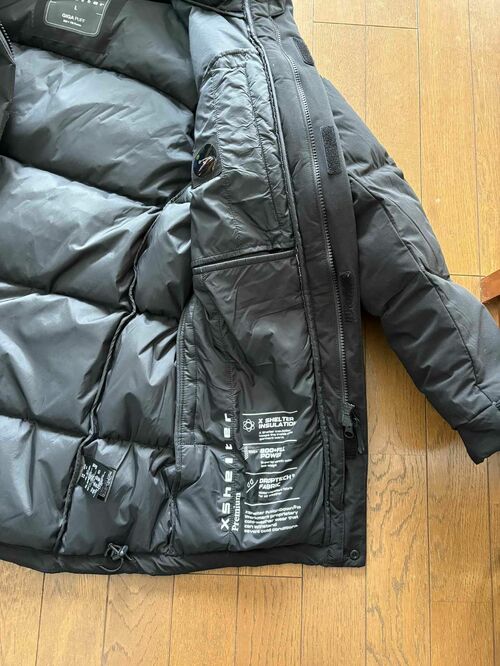 ワークマンの内側には「X Shelter」「800 Fill Power」「DropTech Fabric」と技術名が並ぶ。