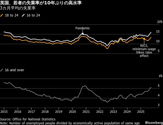 英国の若者の失業率が急上昇し、約10年ぶりの高水準となった。雇用市場減速の影響が、新たに参入する若年層に打撃を与えている。スターマー首相率いる労働党政権に対応を求める圧力が強まった。