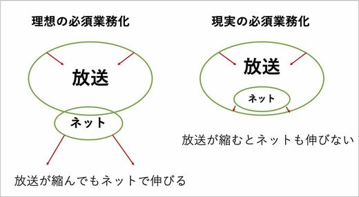 NHKの選択を図にすると、右の「現実」のほうになる。自らネット展開の可能性を縮めてしまった。これでは、NHKがいかにネット展開を強化しても、若い利用者には届かず、将来的なテレビ放送の縮小と共に沈んでしまう。
