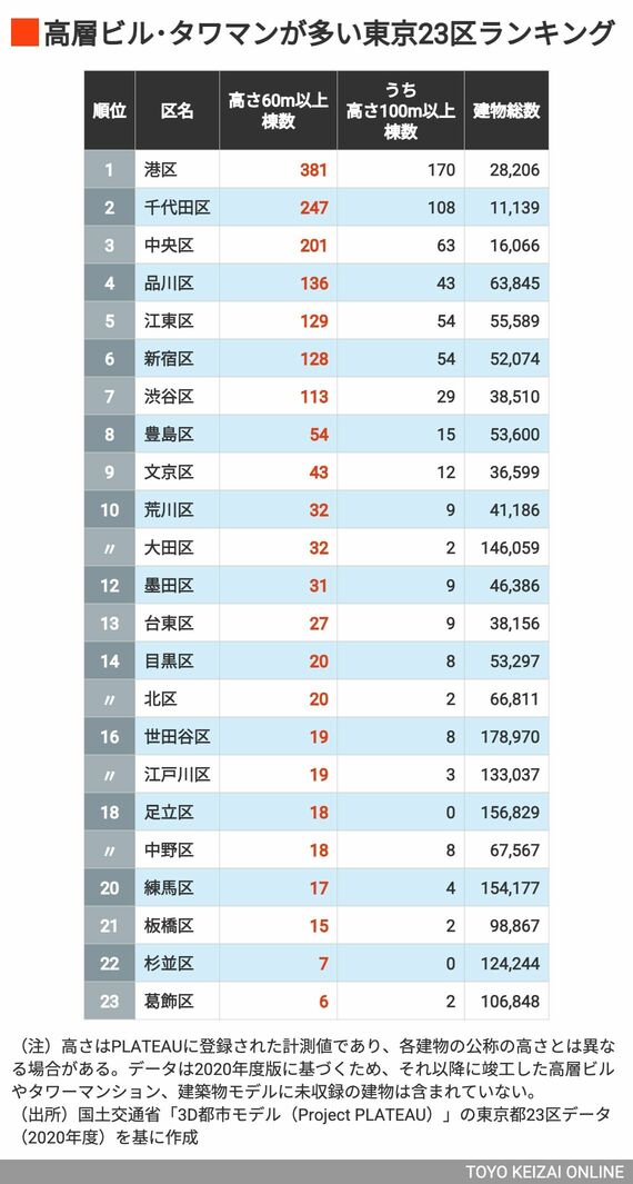 高層ビル・タワマンが多い東京23区ランキング 3D都市モデルから建物約176万棟を集計した結果