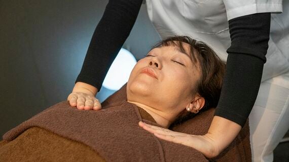 次に、ヒーリングの体験も行った。ヒーリングでは、同じくグリコがプログラム用に開発した非売品のヘスペリジン玄米茶をいただく。その後のヒーリングプログラムでは、半個室で横になり、肩から頭にかけて穏やかな力で触れてもらうことで、心地よいリラックス感が得られた。