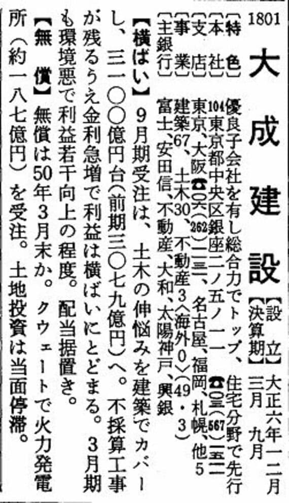 「不採算工事が残るうえ金利急増で利益は横ばいにとどまる」「クウェートで火力発電所(約一八七億円)を受注。土地投資は当面停滞」(大成建設1974年秋号)
