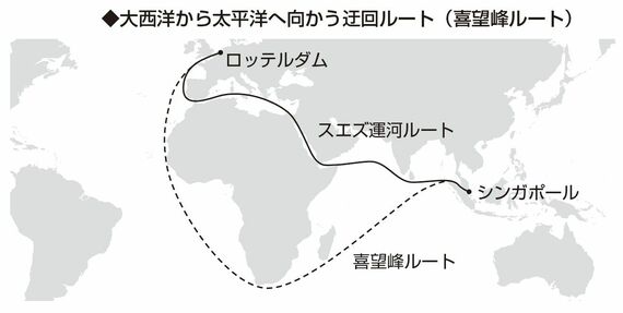この事態を受け、スエズ運河を利用する多くの船舶は、安全を確保するために、アフリカ大陸南端の喜望峰を経由する迂回航路を選ばざるを得なくなりました。