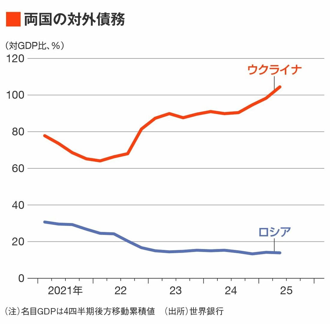 つまり、ロシアは問題がありつつも外国から所得を稼ぐことができており、その一部を戦費に当てている。一方のウクライナは、外国から所得を稼ぐことができていないからこそ、借入を増やし戦費を賄っている状況だ。その結果、開戦前は名目GDPの60%強だったウクライナの対外債務は、2025年4〜6月期までに100%を超えるに至る。