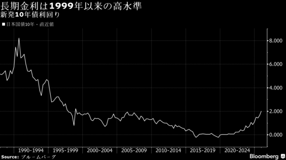19日の債券市場では長期金利(新発10年債利回り)が2.02%と1999年以来の高水準に上昇した。日本銀行の利上げ継続と高市早苗政権の財政拡張への懸念から金利の上昇(債券相場の下落)が続いている。