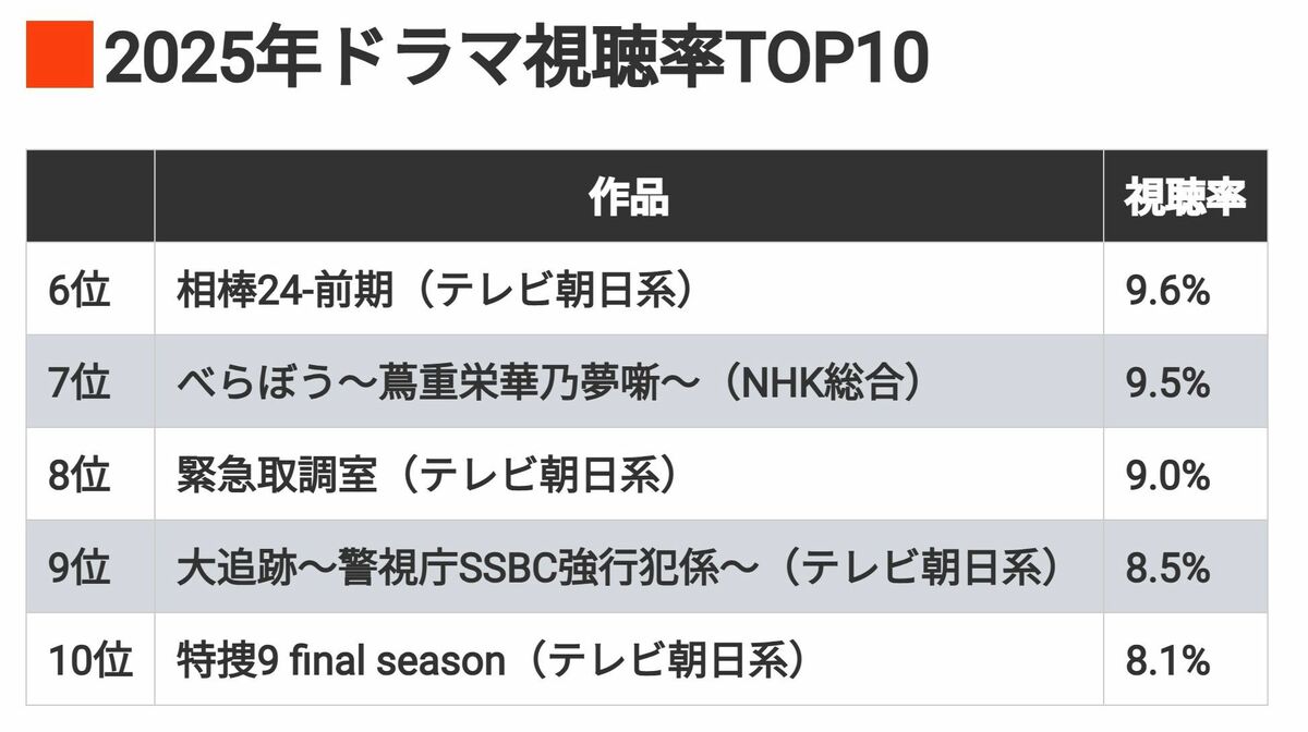 25年の《年間ドラマ視聴率ランキング》が示す「優勝劣敗」 TBSが上位独占、テレ朝が最多選出…"多様性を失ったTOP10"に懸念も