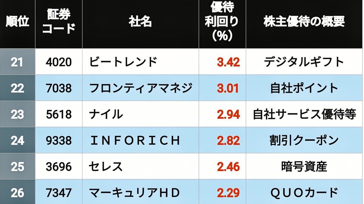 個別銘柄に目を移すと、トップはオンライン書店を運営する富士山マガジンサービス。優待内容は自社取扱雑誌の定期購読商品購入10%割引券や2000円分の自社取扱雑誌定期購読パッケージ商品割引クーポン、傘下の予備校等で使える個別授業チケットなどで、優待利回りは53.46%だった。