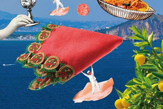 同じく、2026年春夏シーズンタオルハンカチ「ピッツァ」は、真っ赤なトマトソースやフレッシュバジル、チーズまでをレースで表現した遊び心溢れる1枚だ。「Buono!(おいしい)」と添えられた文字も楽しい。