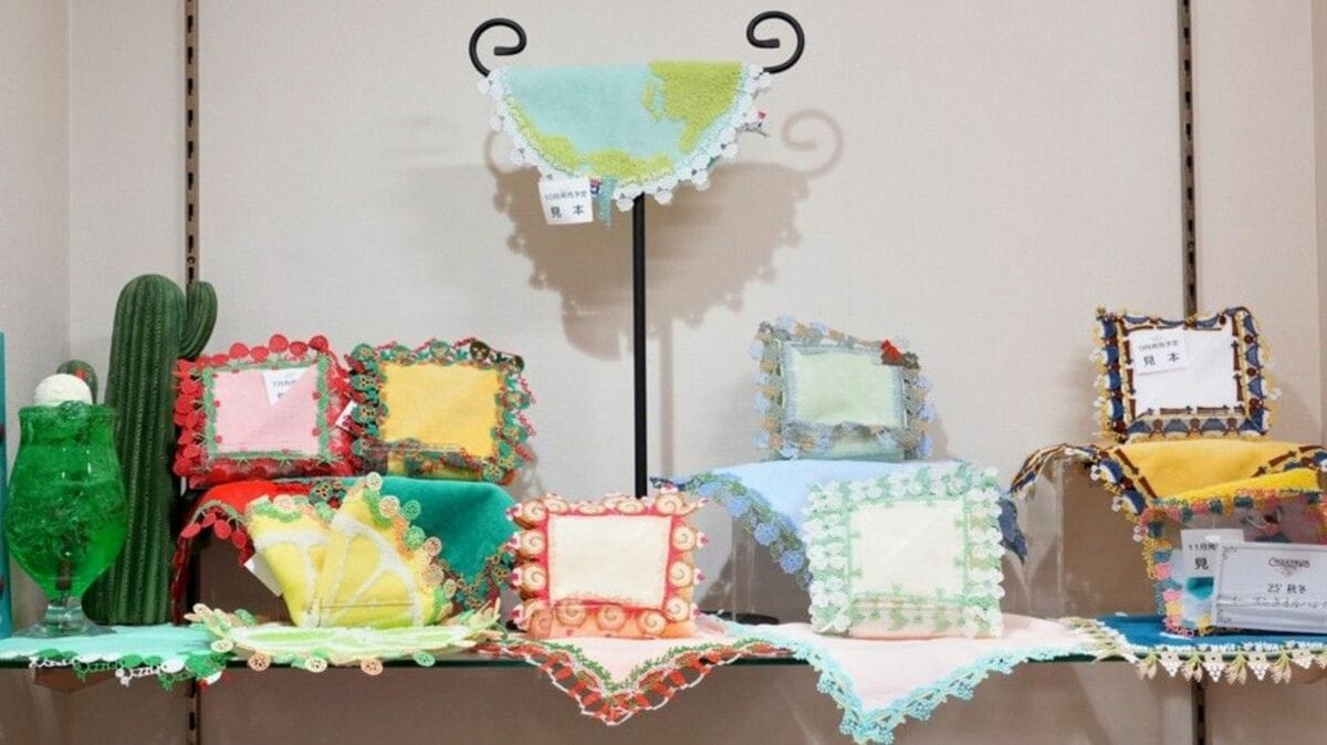 常識を覆すカラフルさと、斬新な絵柄をレースで表現し、思わず誰かに見せたくなるような世界観を表現した横浜・元町の近沢レース店のタオルハンカチ。