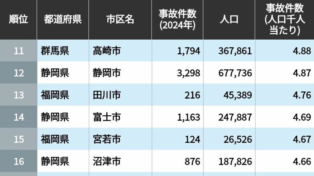警察庁の「交通事故統計情報オープンデータ」から、2024年に発生した人身事故(死者・負傷者が出た事故)を自治体別に集計。住民基本台帳人口(2024年1月1日現在)で割って、人口千人当たりの事故件数を算出しランキングにした。全国の「市」と東京都23区を対象にランキングを作成している。