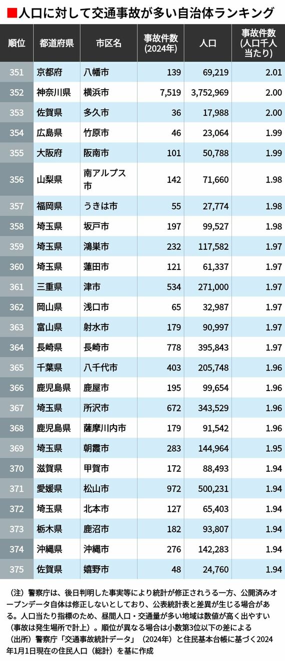 交通事故が人口に対して多い自治体ランキング 上位に入ったのはどこ?