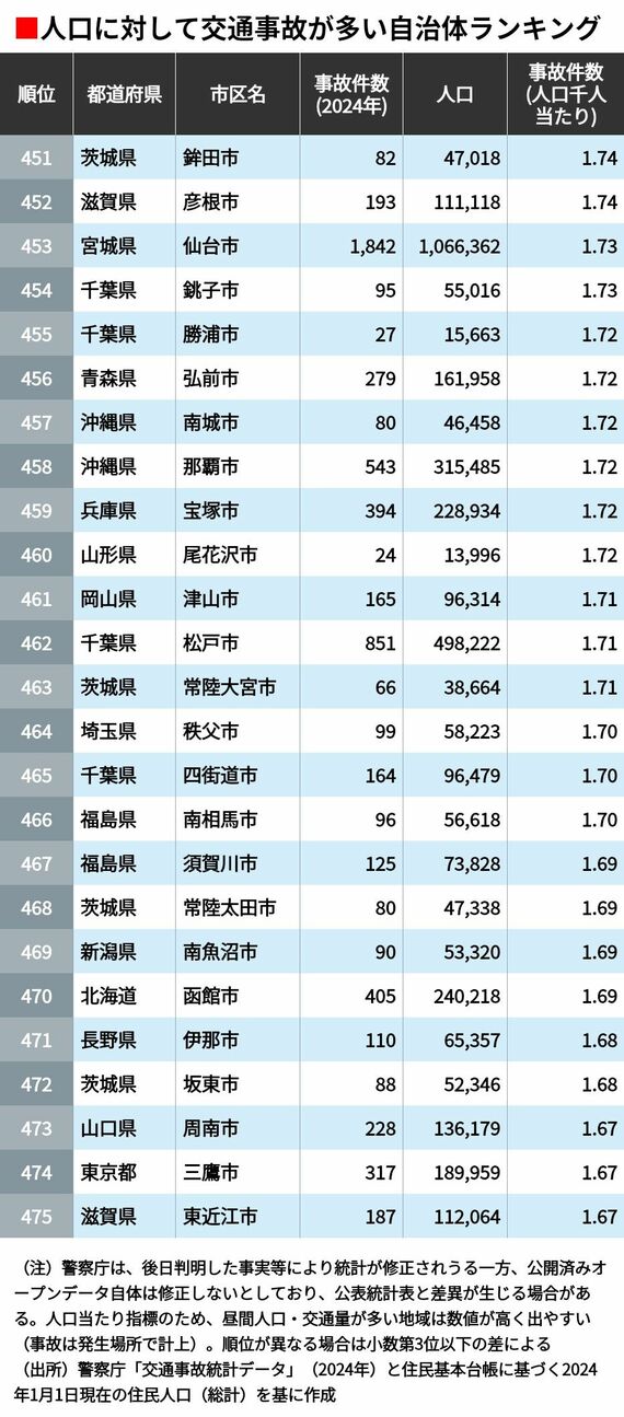 交通事故が人口に対して多い自治体ランキング 上位に入ったのはどこ?