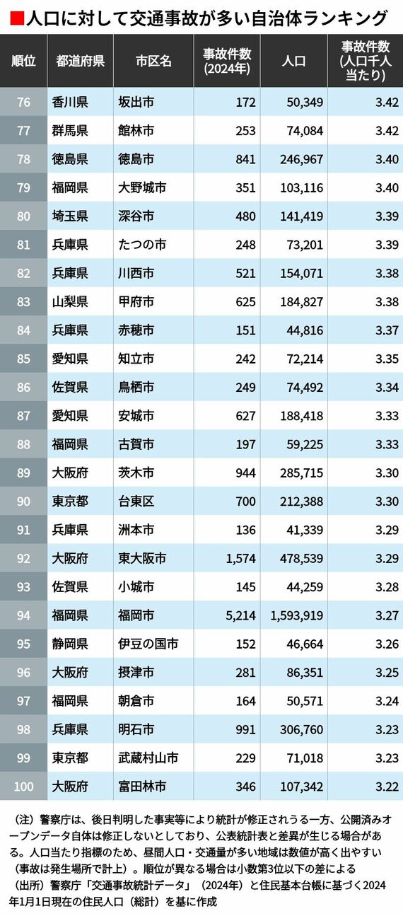 交通事故が人口に対して多い自治体ランキング 上位に入ったのはどこ?