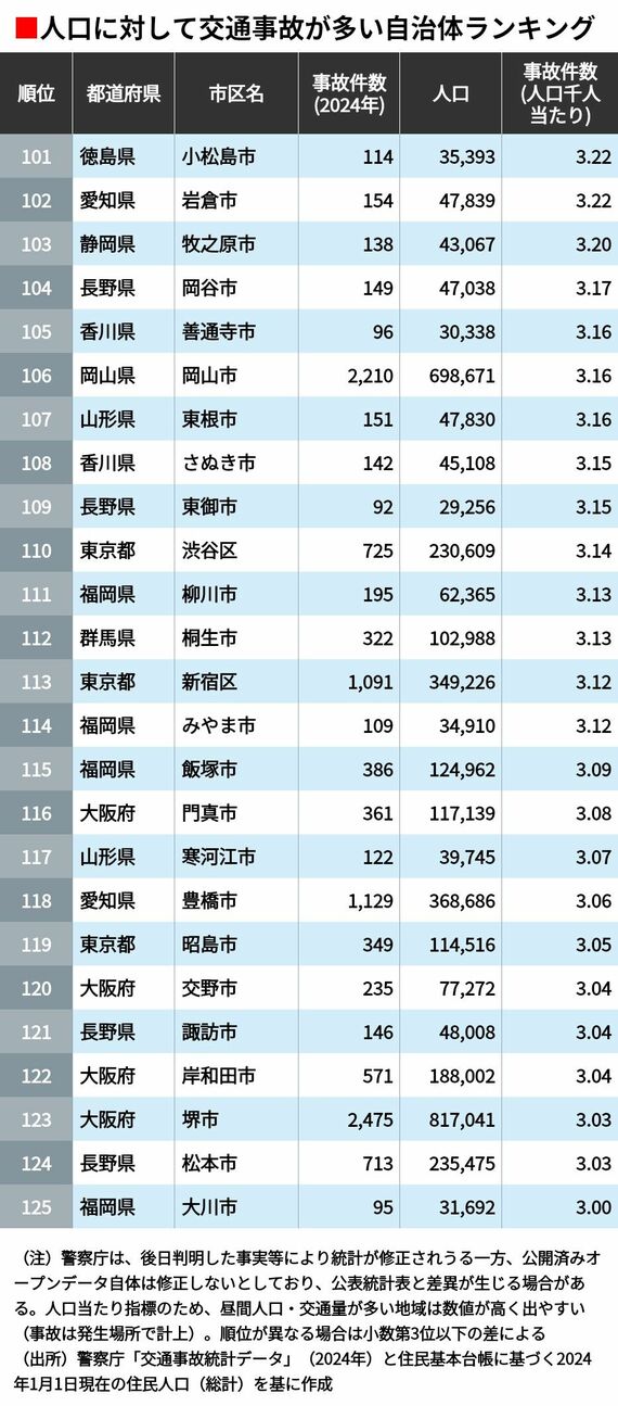 交通事故が人口に対して多い自治体ランキング 上位に入ったのはどこ?
