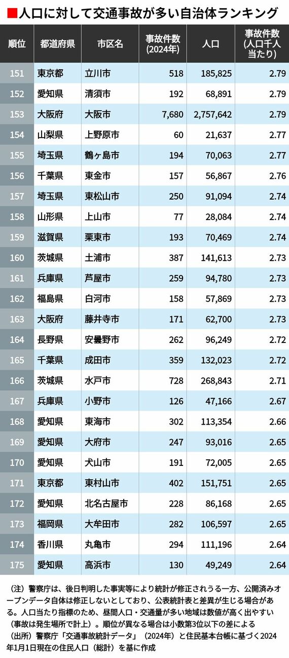 交通事故が人口に対して多い自治体ランキング 上位に入ったのはどこ?