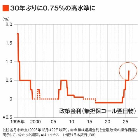 実に30年ぶりの金利水準となった。日本銀行は12月19日、政策金利(金融機関同士がきわめて短い期間で貸し借りする際の金利、無担保コールレート翌日物)の誘導目標を0.75%に引き上げた。2024年3月、異次元金融緩和に幕引きしマイナス金利を解除して以降、24年7月(0.25%)、25年1月(0.5%)に続く利上げだ。