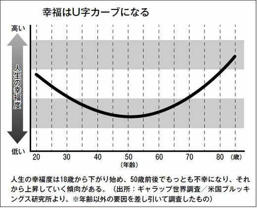 それから、幸せに関して言えば、多くの人は「歳をとればとるほど不幸になる」と思っているかもしれませんが、実際にはその逆です。人間というのは、実は歳を重ねるほど幸せを感じやすくなるのです。