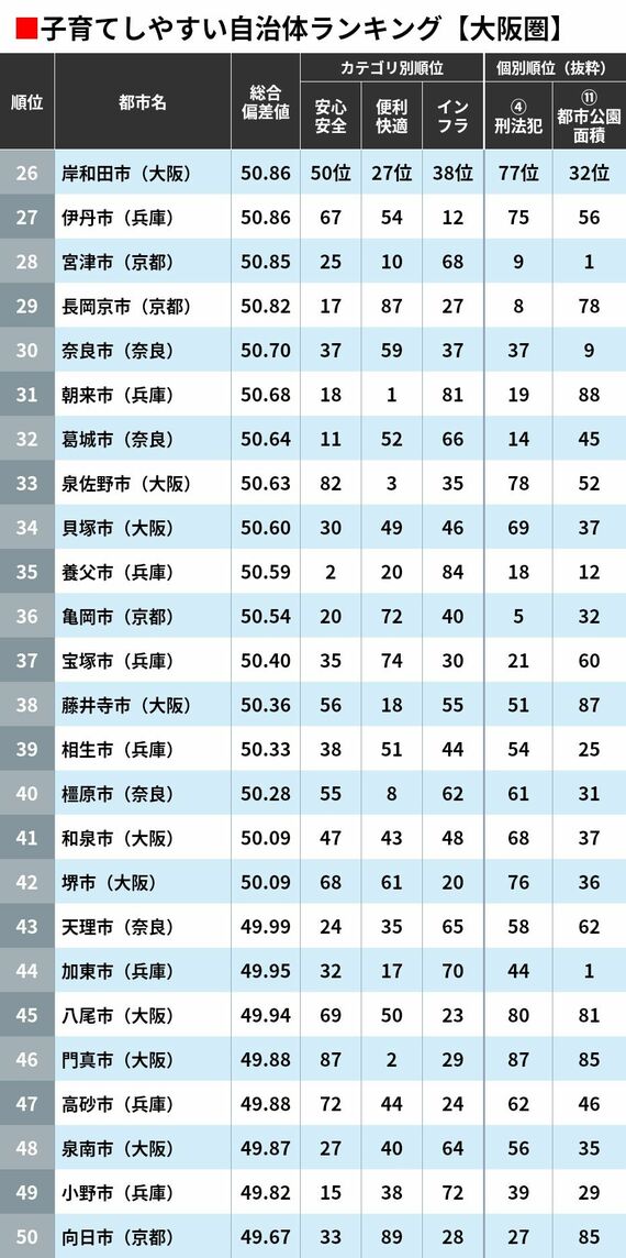 「子育てしやすい自治体ランキング」大阪圏トップ75 5位は大阪府箕面市、4位は大阪市、ではトップ3は?