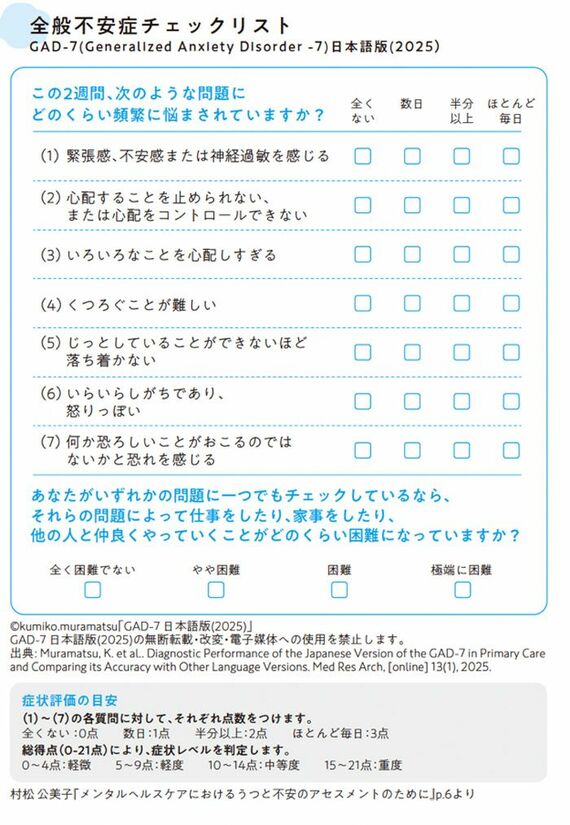 全般不安症の評価尺度として国際的に使われているのがGAD7(Generalized Anxiety Disorder-7)という質問票です。日本不安症学会のホームページで閲覧できますが、それをもとに作成したのが下記のチェックリストです。