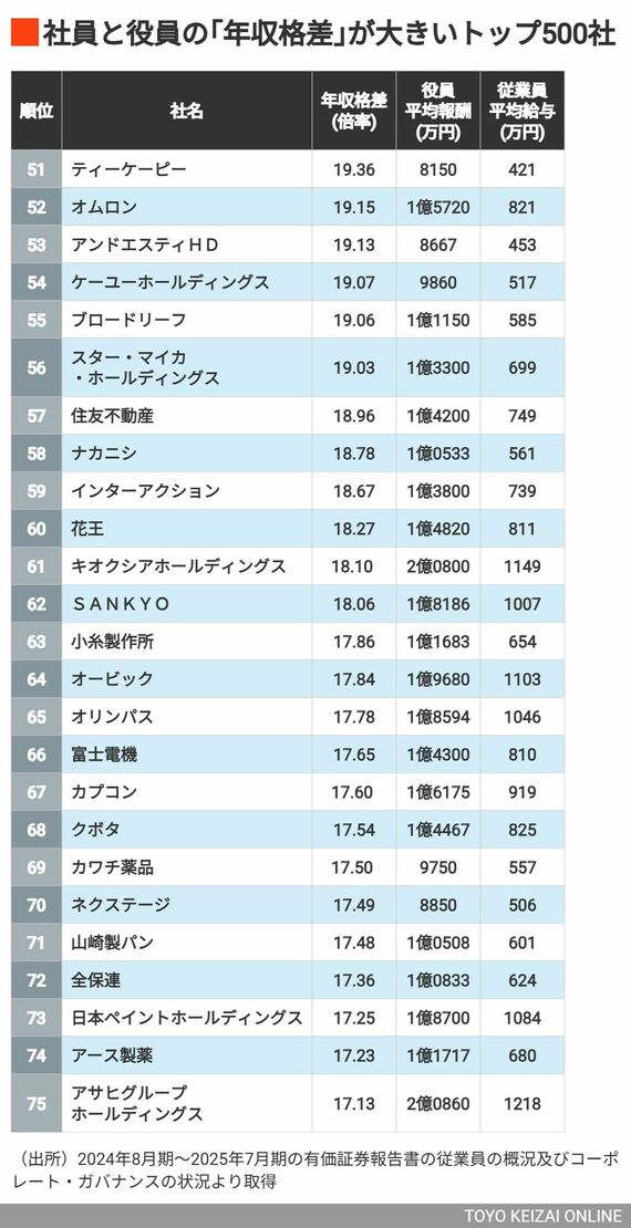 1位は71倍! 社員と役員の「年収格差」が大きい会社ランキングTOP500 役員の平均報酬1億円超は152社に増加