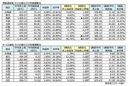 情報通信業では、関東が平均売上高19億831万円、売上成長率58.8%増と突出する一方、利益率が1.3%と5期前と比較して低下した。需要が急拡大する一方で、競争激化により収益性の低下に悩む中小企業が増加しているとみられる。