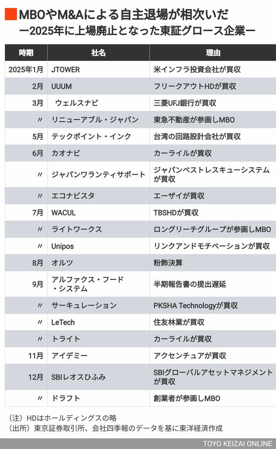 グロース市場の上場社数は26年も減少基調をたどりそうだ。上場廃止基準に抵触しかねない小規模企業はもちろん、同市場の中では大型にあたる時価総額数百億円規模の企業も例外ではない。