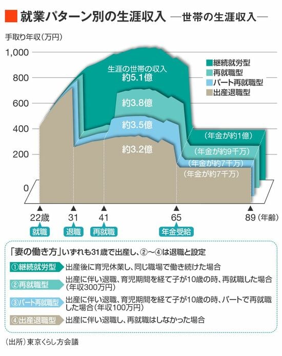 最近、東京都による衝撃的な試算が広く紹介され、多くの人たちに知られるようになってきた。3号を選択した「出産退職型」より2号(厚生年金)のままでいる「継続就労型」は、退職金を除いても生涯世帯収入で約2億円、うち年金で約3000万円多くなるという試算結果だった。