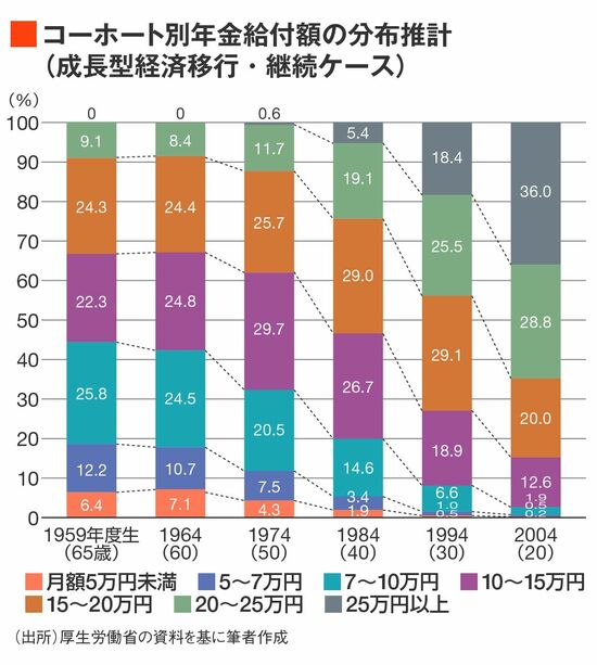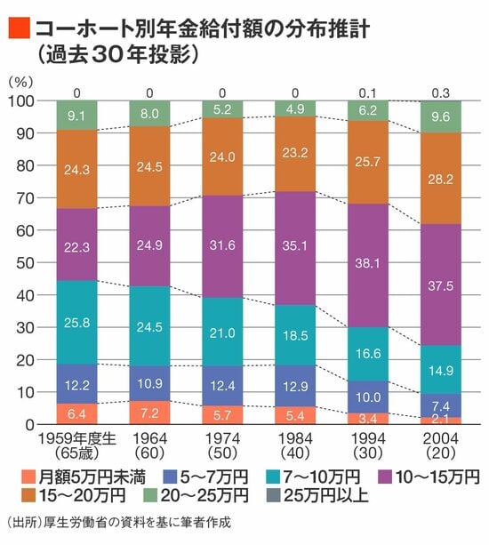 さらには、もし現在の20~30代は65歳の先まで引退をのばすとすれば、65歳時点での年金額を基にした分布推計を上回って、厚生年金加入期間が延びる可能性が高い。その分、将来の年金額は一層高くなる。