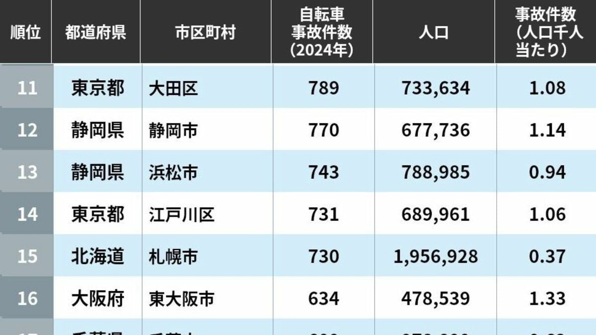 2024年に発生した自転車が関与する交通事故を、警察庁「交通事故統計情報オープンデータ」から集計し、全国の「市」と東京都23区を対象にランキングを作成した。