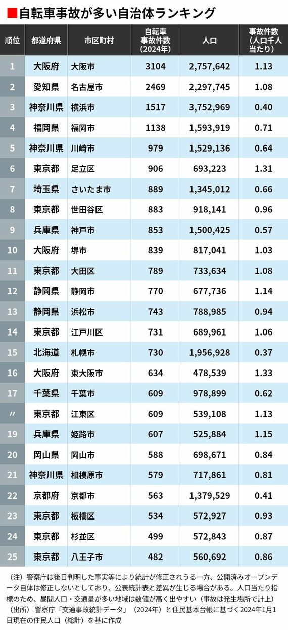 「自転車事故が多い」自治体ランキング300 5位は神奈川県川崎市、4位は福岡市、ではトップ3は?