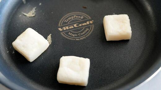 ただし、この方法だと餅に焦げ目がつかない、という弱点もあります。鉄のフライパンを使えば表面温度を220℃以上に上げられるので、中火で焦げ目がつくまで焼くと、さらにおいしく仕上がるでしょう。