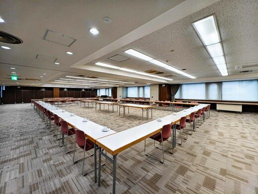 200名以上入るという8階の大会議場。午後の会議のためにセッティングされていた(筆者撮影)