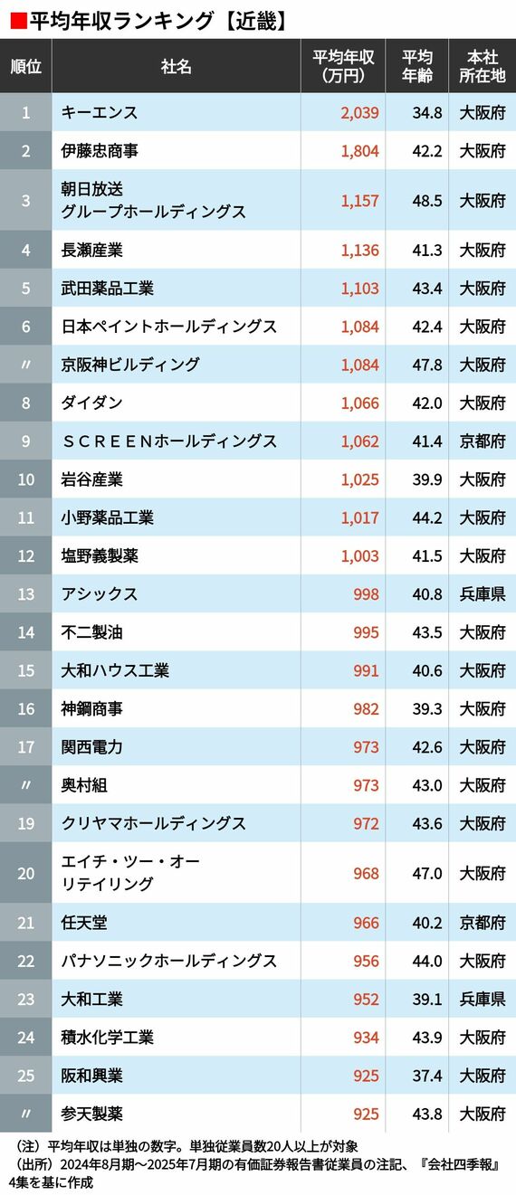 平均年収ランキング「近畿」に本社を置く504社 3位は朝日放送グループホールディングス、2位は伊藤忠商事、では1位は?