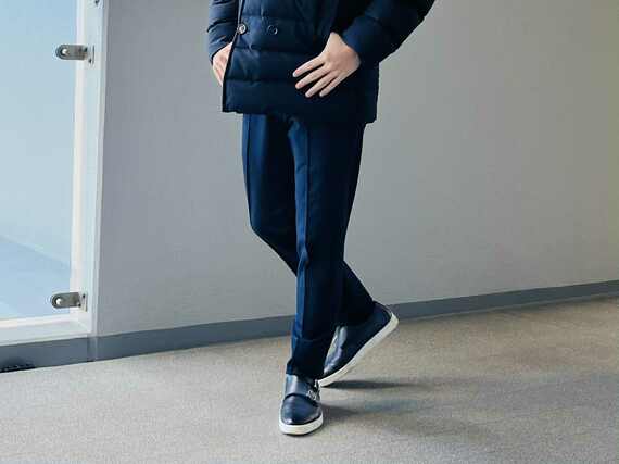 留意点として、裾の長さに言及します。裾上げするとき、靴に覆いかぶさるというより、靴とパンツが触れるか触れないか程度のギリギリを狙いましょう。余計なシワは、ストンと落ちる邪魔になるから。郷に入れば郷に従えという言葉どおり、スキニーパンツの常識をイージースラックスに持ち込みたくないのです。